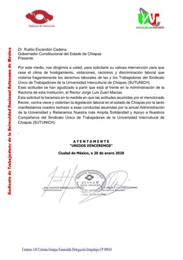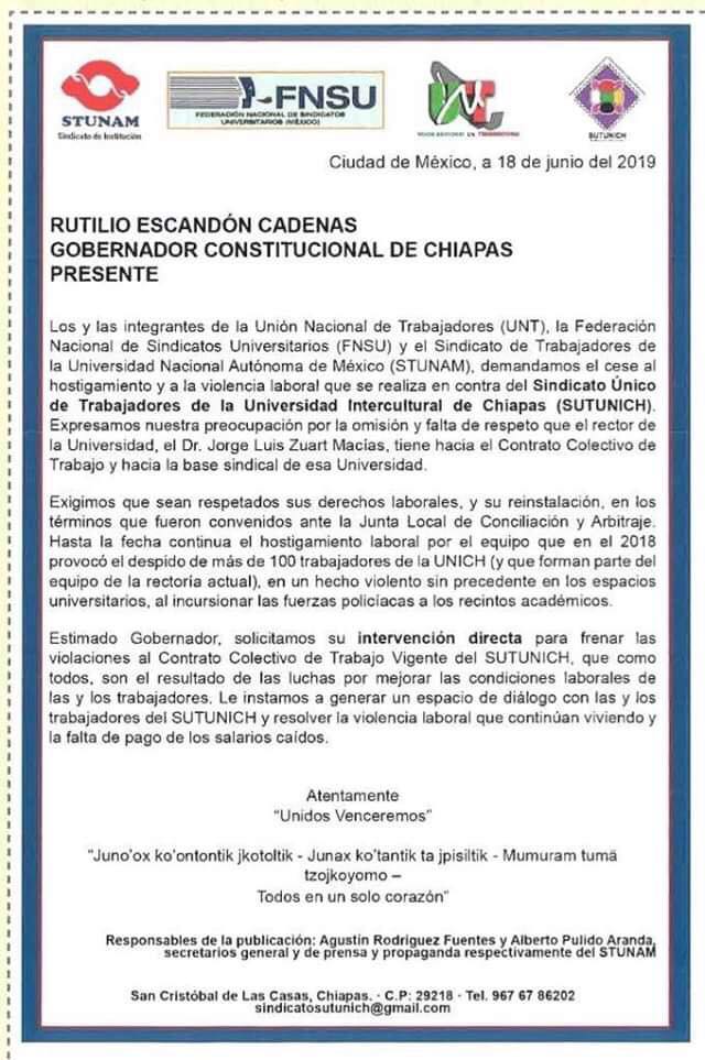 Ante esta ola de injusticias, hacen un llamado al gobernador de Chiapas, Rutilio Escandón Cadenas, para que haya un cese a los atropellos contra la base trabajadora del Sutunich. También exigen que llegue la Auditoría Superior de la Federación para que «salga a flote los enormes derroches de dinero que se están efectuando en la Unich».